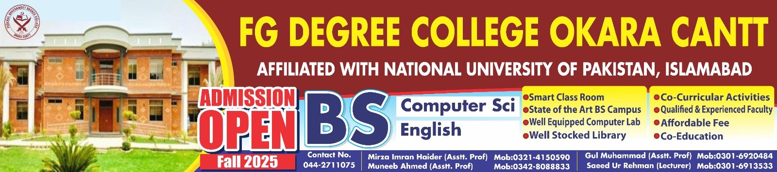 Dear students & respected parents, Assalamualaikum ! It gives me immense pleasure to welcome you to FG Degree College Okara Cantt. Our college is committed to providing quality education in a disciplined and supportive environment. We aim to develop not only academic excellence but also character, leadership, and a sense of social responsibility in our students. Co-curricular activities are an integral part of our educational system. Students are encouraged to participate in sports, and co-curricular activities . These activities help them grow in confidence and build essential life skills. We are proud of our dedicated faculty and hardworking students, and we strive to maintain high standards in all aspects of college life. Best of luck for all our young and motivated students. Principal FG Degree College Okara Cantt